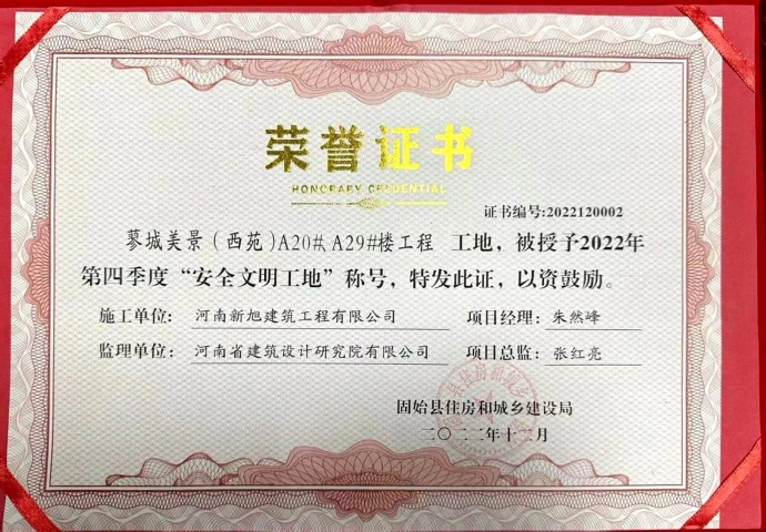近日,新旭建设集团承建的蓼城美景(西苑)A20#、A29#楼工程被固始县住房和城乡建设局授予“2022年第四季度安全文明工地”称号。